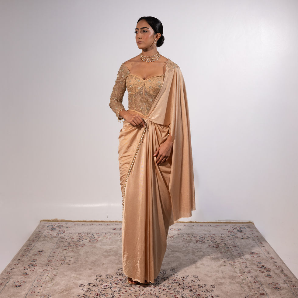 A soft pastel pink ensemble featuring a corseted, full-sleeve blouse with intricate silver and gold silk thread and dori embroidery, paired with a lycra dhoti skirt and pre-draped sari illusion panel for timeless, refined elegance.