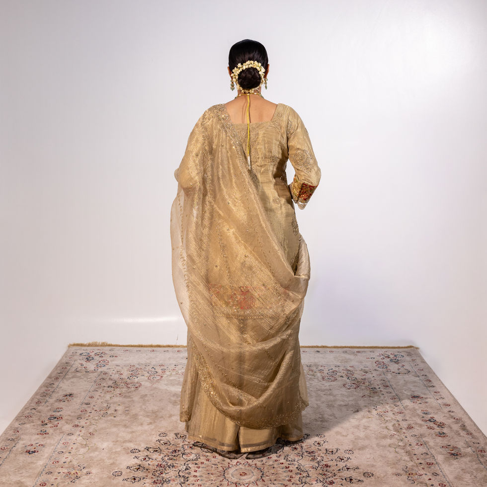 A timeless tissue sharara piece in golden-hued fabric, featuring intricate silk thread and glass bead embroidery that unites the kameez, skirt, and dupatta in refined harmony.
