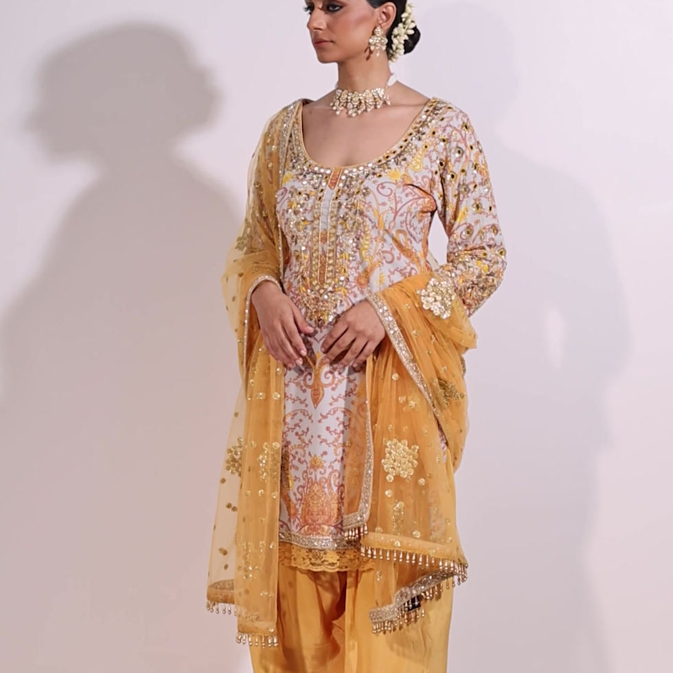 A Parsi salwar suit in warm yellows and golds, featuring hand-embellished paisley print and a soft net dupatta for effortless elegance.