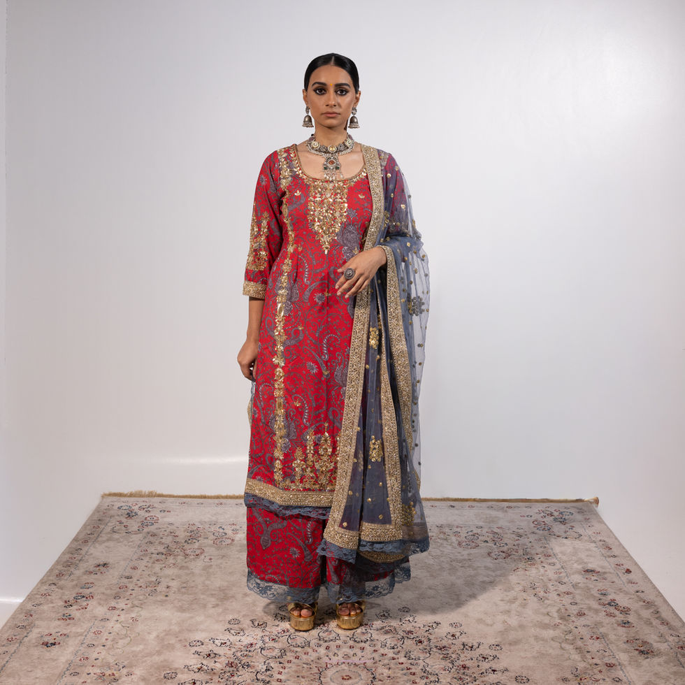 A harmonious blend of tradition and contemporary flair, this paisley-printed georgette Palazzo suit features a rich combination of vermilion red and dusty dolphin grey. The kameez (top) is meticulously hand-embrodieried with antique and golden sequins, glass beads, and delicate beadwork, creating a luminous, textured finish. The soft net dupatta, adorned with matching sequined embroidery, complements the piece with graceful movement. Playful yet sophisticated, this ensemble captures the perfect balance of classic elegance and modern charm.