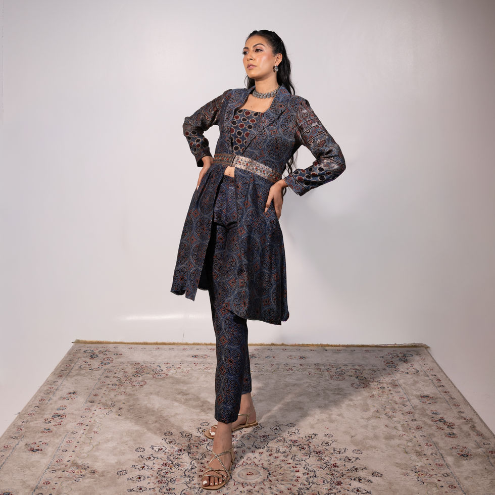 A one-off Indowestern couture ensemble in dusty blue and earthy tones, featuring hand-block-printed Ajrak print, this piece comprises a blazer, pencil trousers and blouse, with a hand-embellished attached belt—heritage-inspired, contemporary, and meticulously crafted.