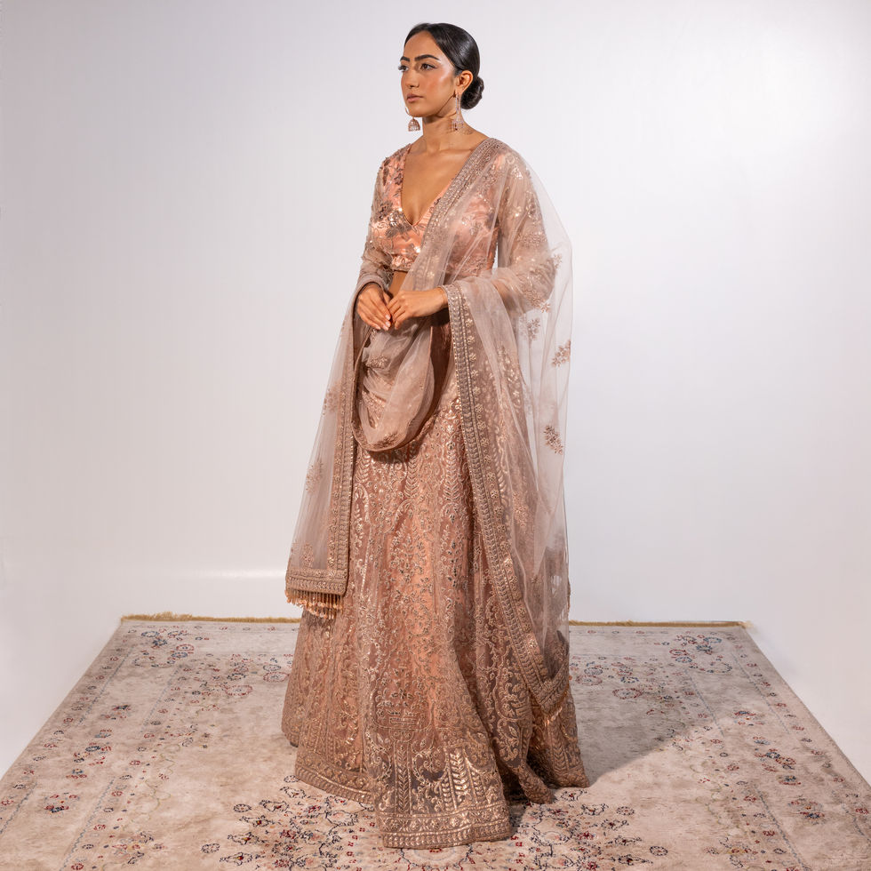 A one-off couture lehenga set with leather-inspired embroidery, dusty rose sequin-lined skirt, glass-beaded blouse with sheer back, and a soft net dupatta for refined shimmer and dimensional elegance.